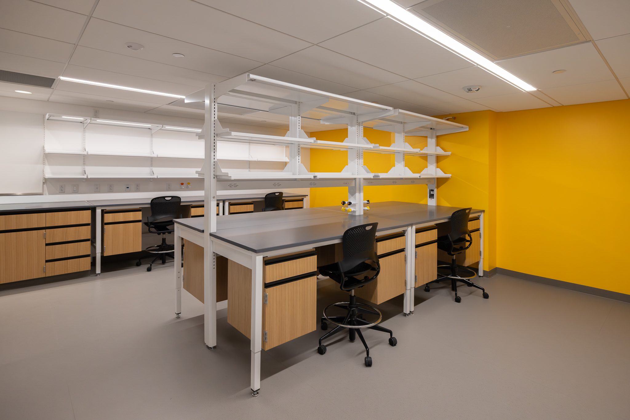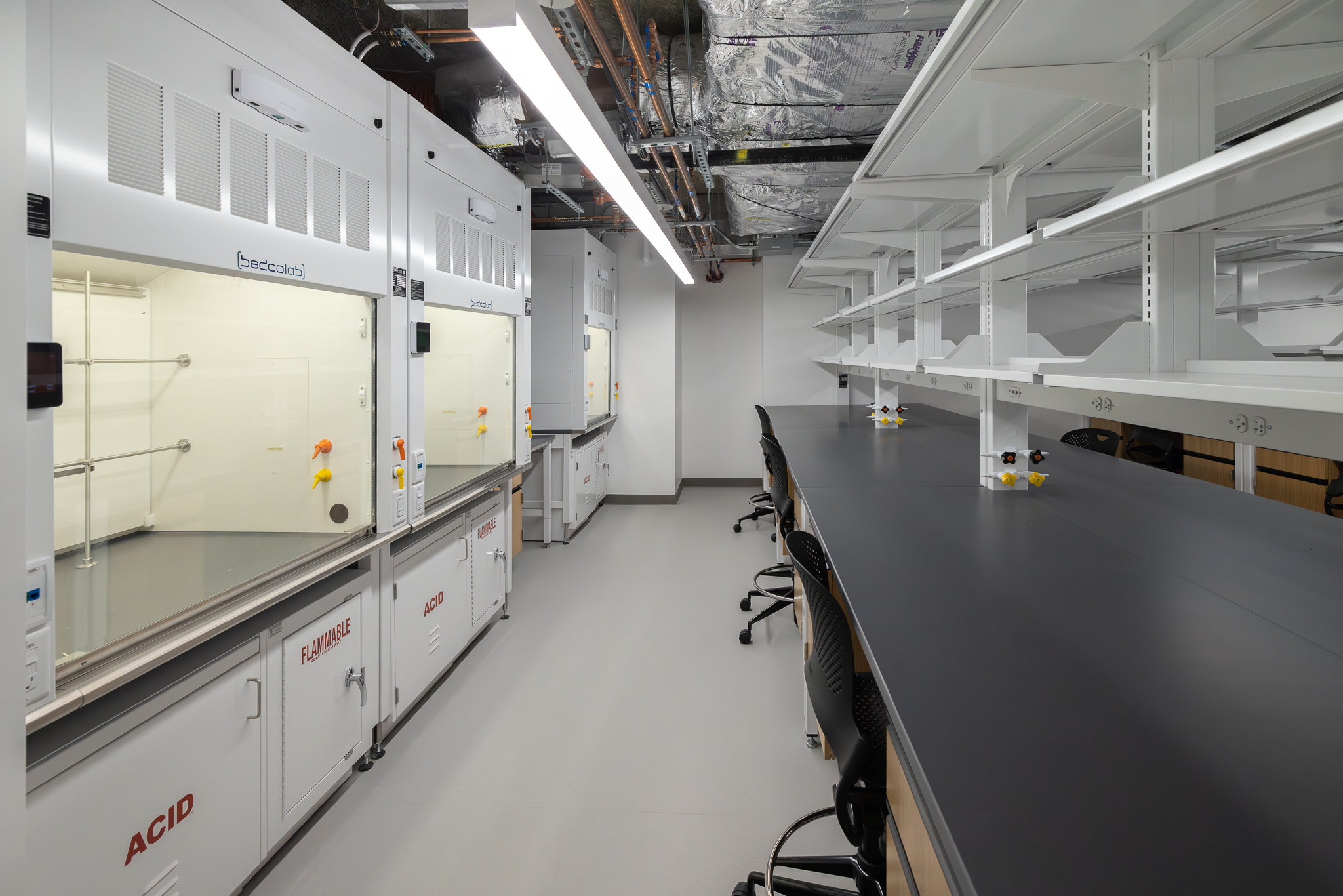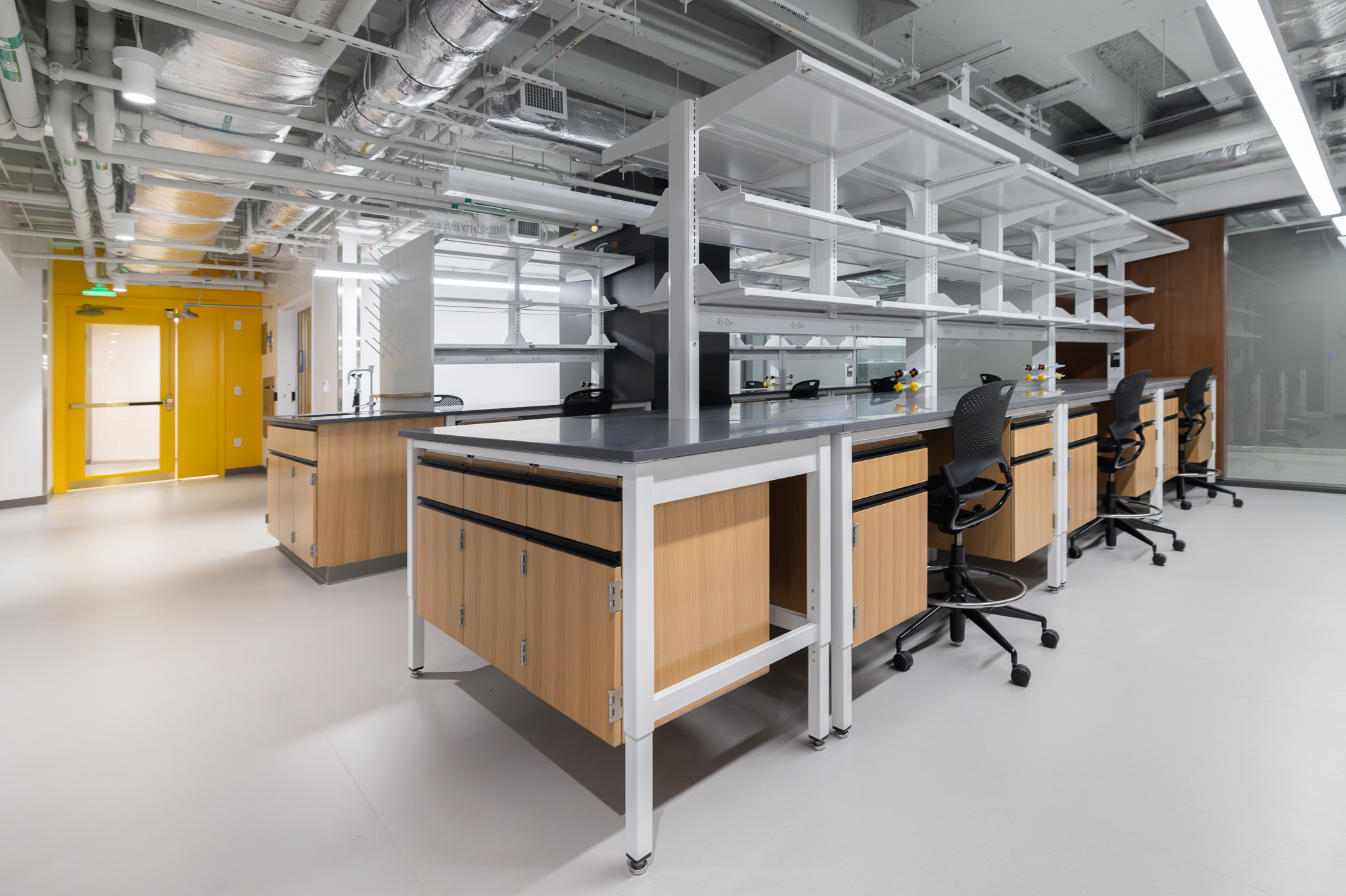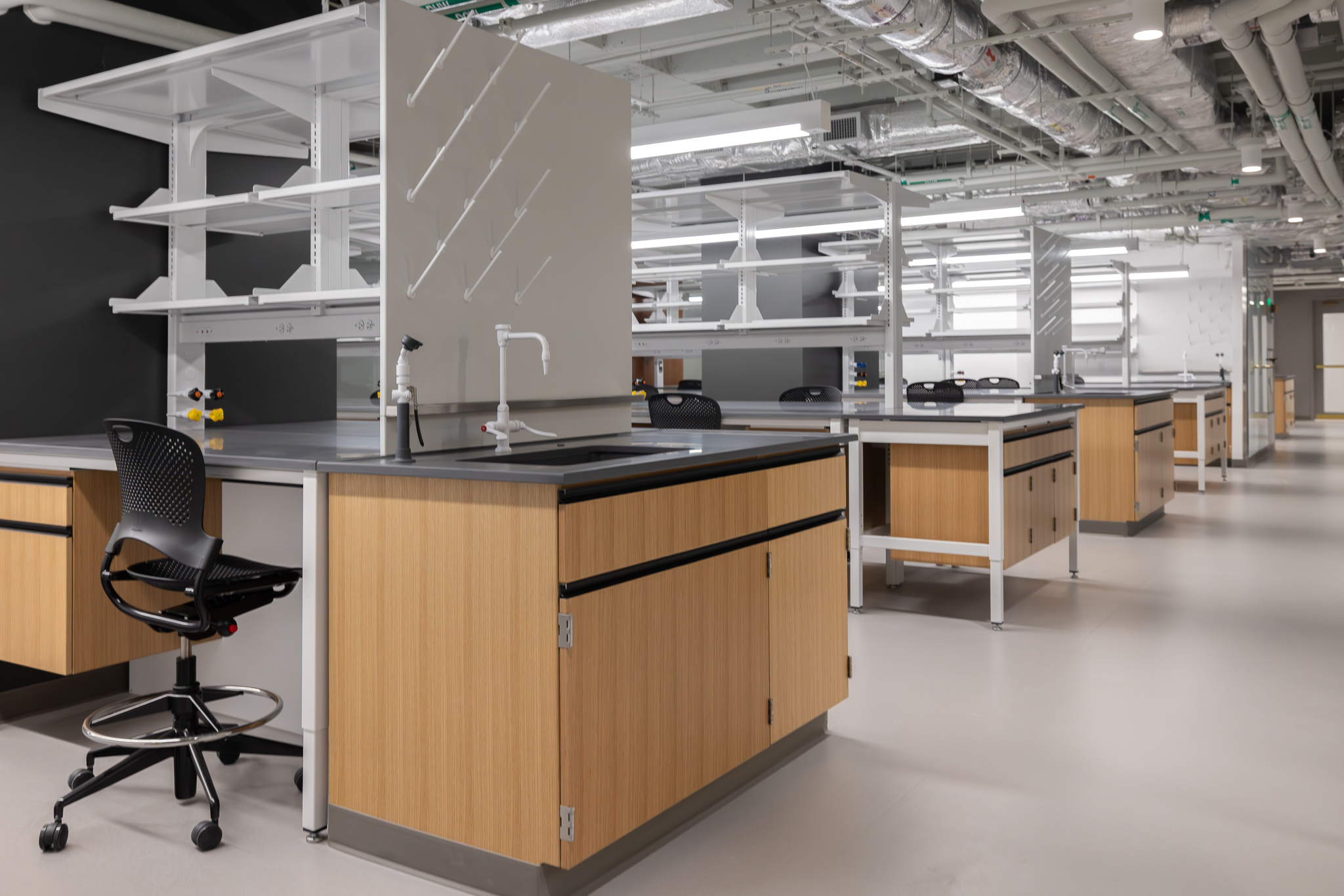 The laboratory bench systems, wood casework, and fume hoods featured high-end finishes and custom options, demanding close collaboration among all project partners. Through detailed planning, proactive communication, and a shared commitment to quality, H2I Group successfully delivered a solution that met both functional requirements and design expectations.